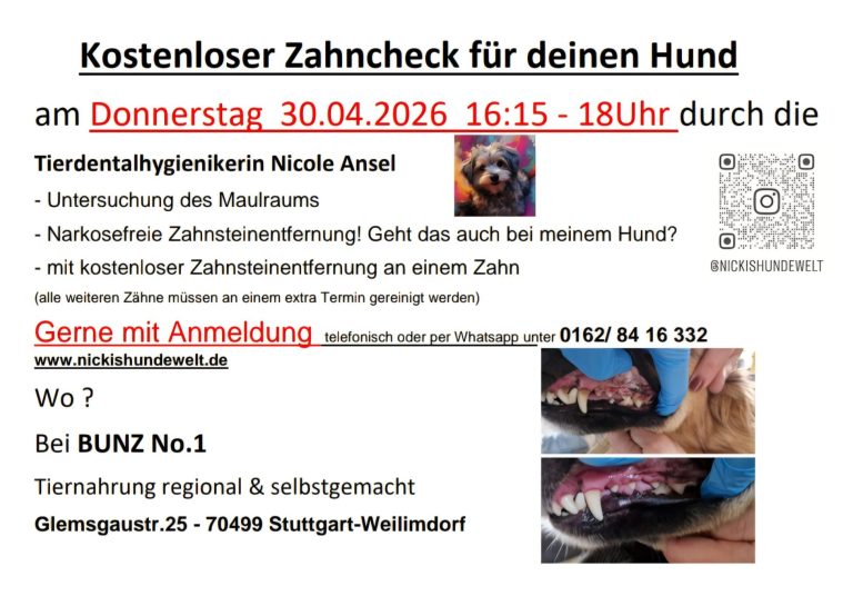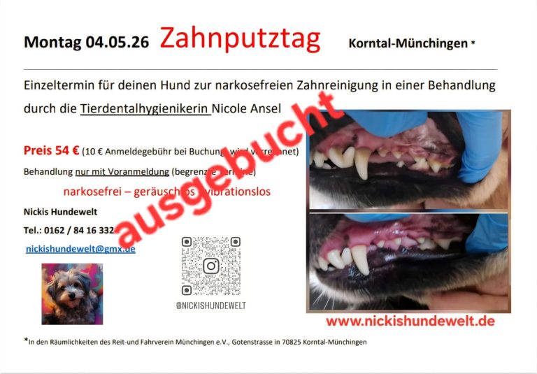 An diesem Tag kann, wenn du das wünschst, probeweise von einem Zahn der Zahnstein entfernt werden. An diesem Tag kannst du testen, ob dein Hund mitmacht. (Alle weiteren Zähne müssen bei einem Hausbesuch oder an einem Zahnputztag vom Zahnstein befreit werden.)