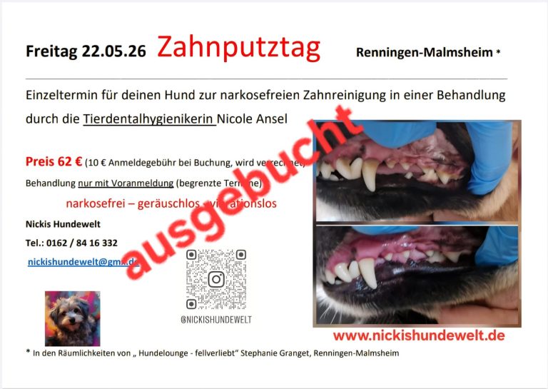 An diesem Tag kann, wenn du das wünschst, probeweise von einem Zahn der Zahnstein entfernt werden. An diesem Tag kannst du testen, ob dein Hund mitmacht. (Alle weiteren Zähne müssen bei einem Hausbesuch oder an einem Zahnputztag vom Zahnstein befreit werden.)