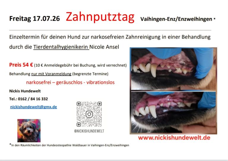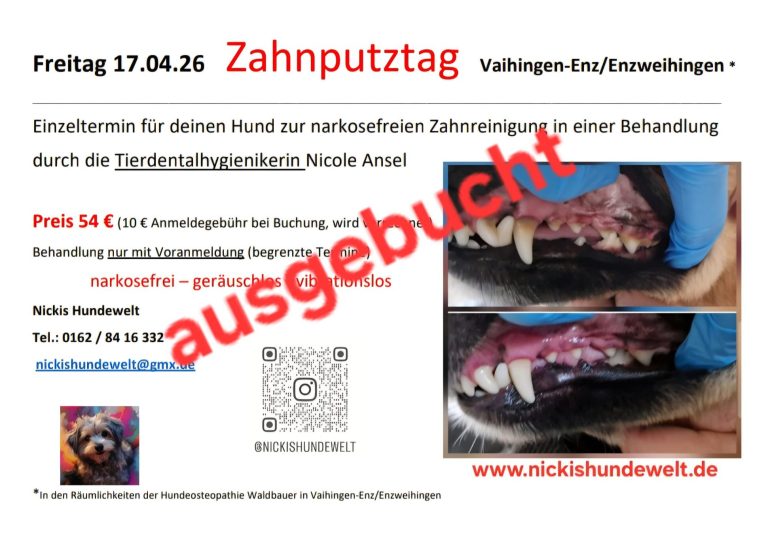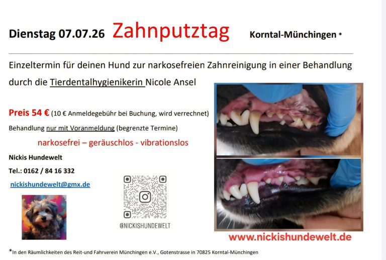An diesem Tag kann, wenn du das wünschst, probeweise von einem Zahn der Zahnstein entfernt werden. An diesem Tag kannst du testen, ob dein Hund mitmacht. (Alle weiteren Zähne müssen bei einem Hausbesuch oder an einem Zahnputztag vom Zahnstein befreit werden.)