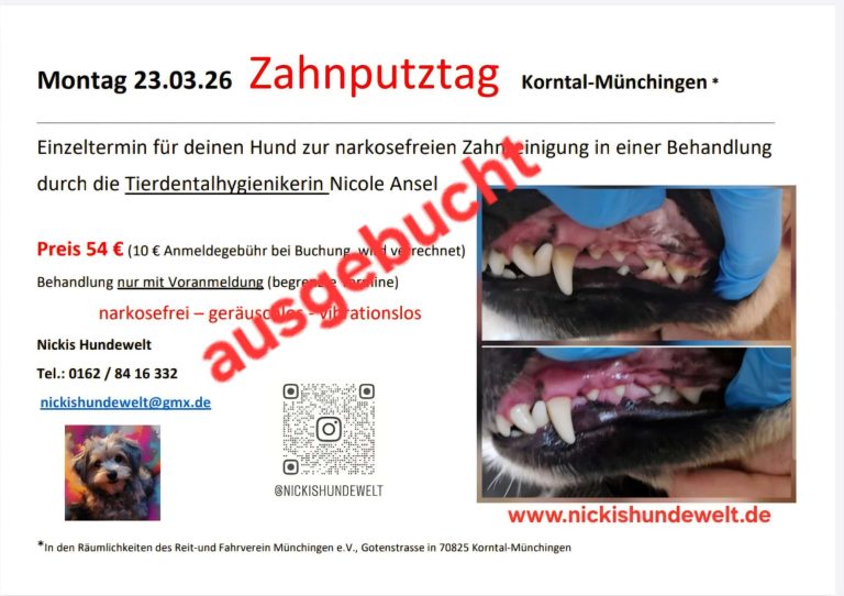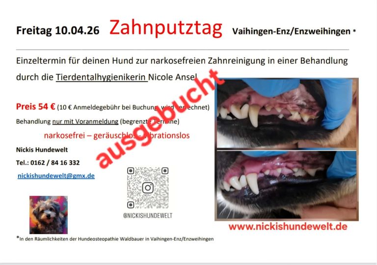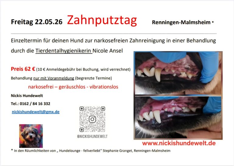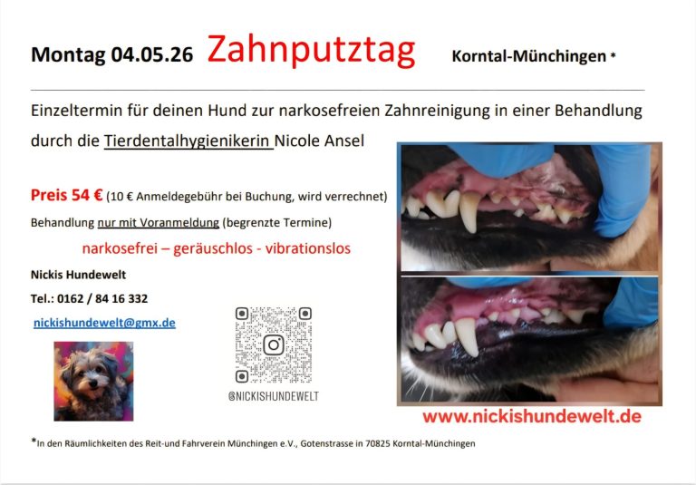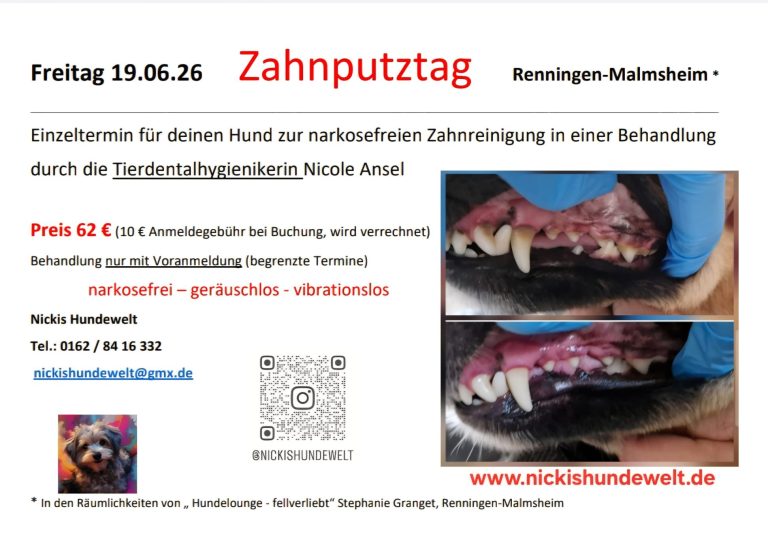 An diesem Tag kann, wenn du das wünschst, probeweise von einem Zahn der Zahnstein entfernt werden. An diesem Tag kannst du testen, ob dein Hund mitmacht. (Alle weiteren Zähne müssen bei einem Hausbesuch oder an einem Zahnputztag vom Zahnstein befreit werden.)
